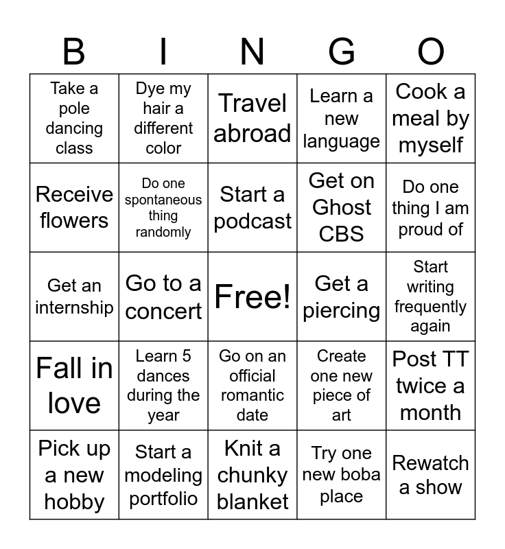 This bingo card has a free space and 24 words: Learn 5 dances during the year, Start a modeling portfolio, Start a podcast, Pick up a new hobby, Cook a meal by myself, Take a pole dancing class, Receive flowers, Dye my hair a different color, Get a piercing, Go on an official romantic date, Get on Ghost CBS, Get an internship, Create one new piece of art, Post TT twice a month, Do one spontaneous thing randomly, Try one new boba place, Start writing frequently again, Travel abroad, Do one thing I am proud of, Go to a concert, Rewatch a show, Fall in love, Learn a new language and Knit a chunky blanket.