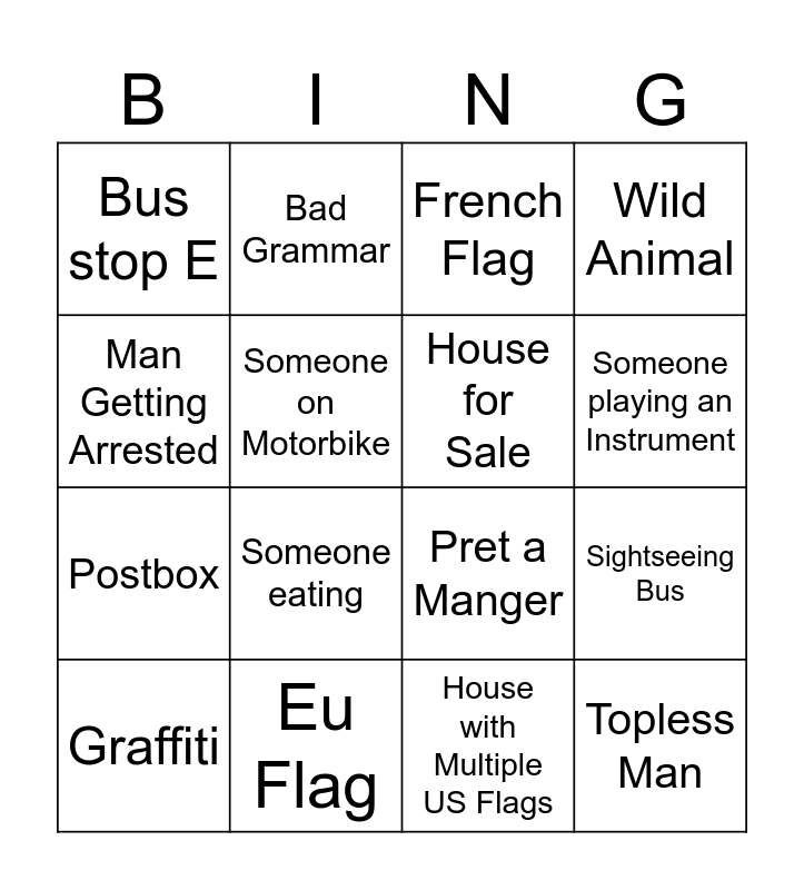 This bingo card has 16 words: Eu Flag, Sightseeing Bus, French Flag, Bus stop E, Postbox, Bad Grammar, Pret a Manger, House with Multiple US Flags, Man Getting Arrested, Someone on Motorbike, Graffiti, Wild Animal, Someone eating, Someone playing an Instrument, House for Sale and Topless Man.