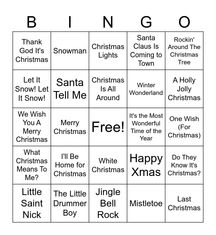 This bingo card has a free space and 50 words: All I Want for Christmas, Last Christmas, How to Make Gravy, Jingle Bell Rock, I'll Be Home for Christmas, It's Beginning to Look a Lot Like Christmas, Snowman, Sleigh Ride, Let It Snow! Let It Snow!, Have Yourself a Merry Little Christmas, Santa Tell Me, Santa Claus Is Coming to Town, Do They Know It's Christmas?, Happy Xmas, Blue Christmas, Baby It's Cold Outside, Christmas Is All Around, It's the Most Wonderful Time of the Year, Feliz Navidad, Rockin' Around The Christmas Tree, Merry Christmas, Mistletoe, Thank God It's Christmas, Winter Wonderland, I Wish It Could Be Christmas Everyday, Merry Christmas Everyone, A Holly Jolly Christmas, Run Rudolph Run, Christmas Lights, White Christmas, Silver Bells, Santa Baby, Christmas (Baby Please Come Home), Merry Christmas Baby, The Little Drummer Boy, Driving Home for Christmas, Silent Night, 8 Days of Christmas, Christmas All Over Again, One Wish (For Christmas), Step Into Christmas, You Make It Feel Like Christmas, Fairytale of New York, Christmas In Hollis, Little Saint Nick, We Wish You A Merry Christmas, Frosty The Snowman, What Are You Doing New Year's Eve?, What Christmas Means To Me? and (It Must've Been Ol') Santa Claus.