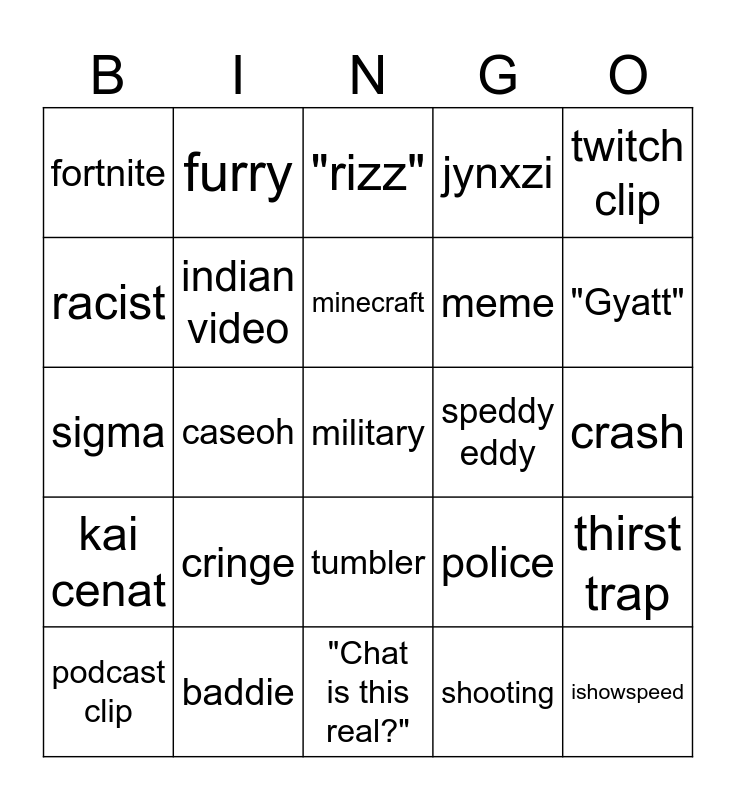This bingo card has a free space and 24 words: cringe, baddie, minecraft, podcast clip, twitch clip, fortnite, racist, furry, speddy eddy, tumbler, meme, sigma, police, thirst trap, indian video, shooting, crash, "rizz", "Gyatt", caseoh, ishowspeed, kai cenat, jynxzi and "Chat is this real?".