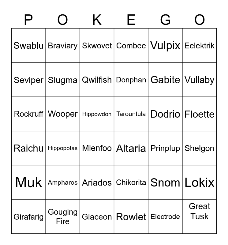 This bingo card has 36 words: Raichu, Hippopotas, Glaceon, Donphan, Dodrio, Floette, Swablu, Gouging Fire, Skwovet, Chikorita, Gabite, Eelektrik, Muk, Wooper, Qwilfish, Combee, Snom, Shelgon, Seviper, Slugma, Mienfoo, Altaria, Prinplup, Lokix, Rockruff, Braviary, Hippowdon, Rowlet, Vulpix, Vullaby, Girafarig, Ampharos, Ariados, Tarountula, Electrode and Great Tusk.