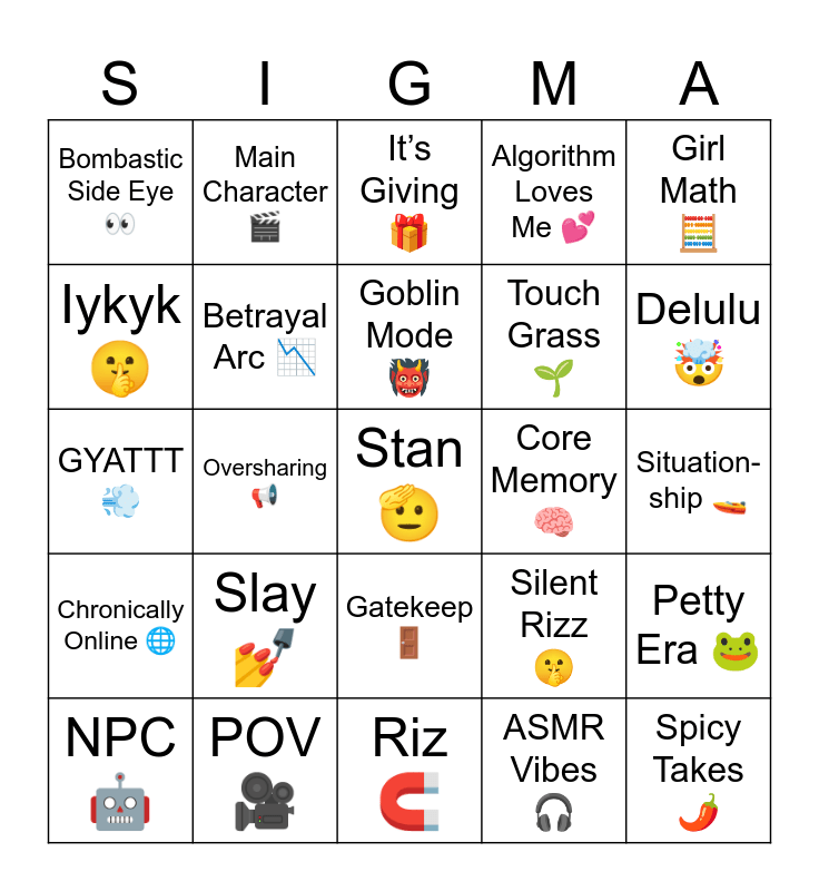 This bingo card has 25 words: Slay ๐ , Riz ๐งฒ, Goblin Mode ๐น, NPC ๐ค, Girl Math ๐งฎ, Bombastic Side Eye ๐, Iykyk ๐คซ, Main Character ๐ฌ, Core Memory ๐ง , Gatekeep ๐ช, Touch Grass ๐ฑ, GYATTT ๐จ, Silent Rizz ๐คซ, Petty Era ๐ธ, Betrayal Arc ๐, Spicy Takes ๐ถ๏ธ, Situation-ship ๐ค, Itโs Giving ๐, Delulu ๐คฏ, Oversharing ๐ข, Stan ๐ซก, POV ๐ฅ, Chronically Online ๐, Algorithm Loves Me ๐ and ASMR Vibes ๐ง.