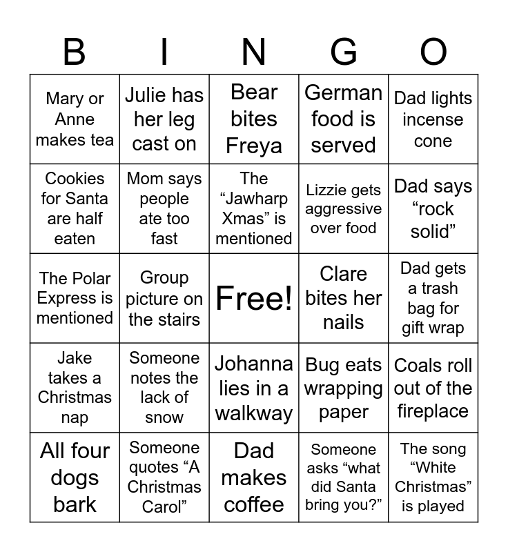 This bingo card has a free space and 29 words: All four dogs bark, Someone opens a window because it’s hot, Group picture on the stairs, Someone suggests a walk, Mary or Anne makes tea, Bear bites Freya, Mom says people ate too fast, Someone notes the lack of snow, Clare bites her nails, Someone quotes “A Christmas Carol”, Dad gets a trash bag for gift wrap, The song “White Christmas” is played, Dad makes coffee, Someone asks “what did Santa bring you?”, Dad says “rock solid”, Someone quotes “It’s a Wonderful Life”, Johanna lies in a walkway, Jake takes a Christmas nap, Dad lights incense cone, The Polar Express is mentioned, Bug eats wrapping paper, Lawren tries to leave early, Lizzie gets aggressive over food, Cookies for Santa are half eaten, German food is served, Julie has her leg cast on, Coals roll out of the fireplace, The “Jawharp Xmas” is mentioned and Mom takes a video of everyone.