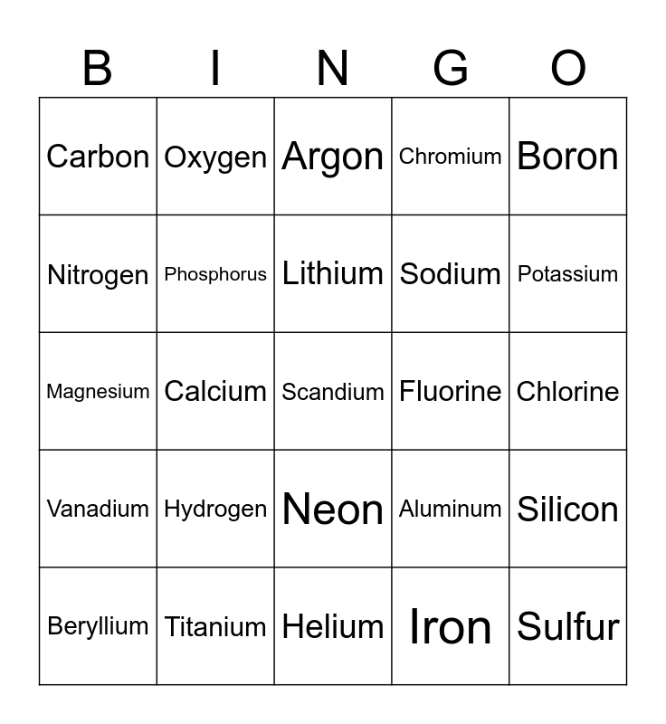 This bingo card has 25 words: Hydrogen, Helium, Lithium, Beryllium, Boron, Carbon, Nitrogen, Oxygen, Fluorine, Neon, Sodium, Magnesium, Aluminum, Silicon, Phosphorus, Sulfur, Chlorine, Argon, Potassium, Calcium, Scandium, Titanium, Vanadium, Chromium and Iron.