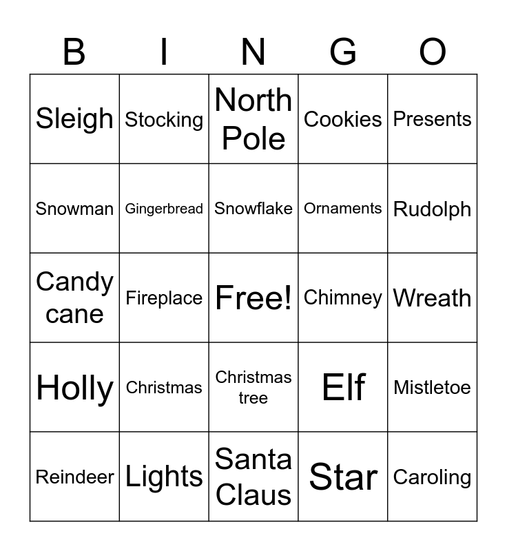 This bingo card has a free space and 25 words: Christmas, Santa Claus, Snowflake, Reindeer, Presents, Sleigh, Snowman, Stocking, Chimney, Christmas tree, Ornaments, Candy cane, Elf, Mistletoe, Gingerbread, Bells, Wreath, North Pole, Rudolph, Fireplace, Caroling, Lights, Holly, Cookies and Star.