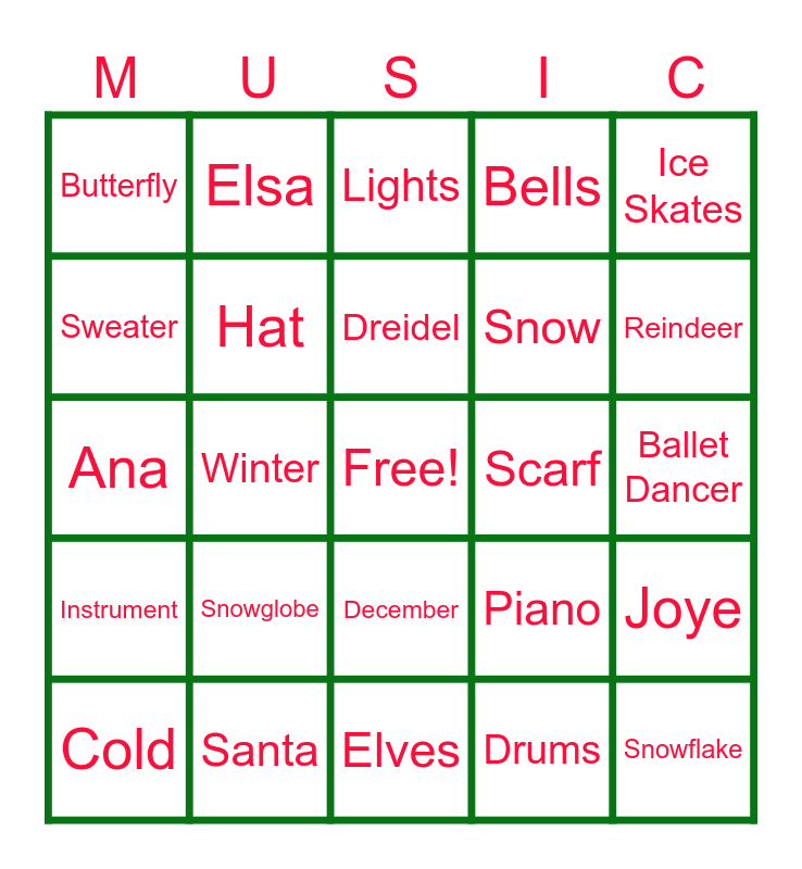 This bingo card has a free space and 25 words: Snowglobe, Elves, Dreidel, Cold, Ice Skates, Butterfly, Sweater, Elsa, Scarf, December, Snow, Ana, Piano, Joye, Hat, Shaker, Ballet Dancer, Lights, Reindeer, Winter, Snowflake, Santa, Instrument, Bells and Drums.