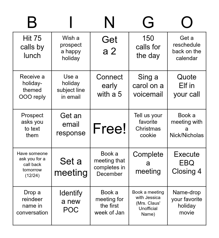 This bingo card has a free space and 24 words: Set a meeting, Identify a new POC, Connect early with a 5, Drop a reindeer name in conversation, Get a reschedule back on the calendar, Hit 75 calls by lunch, Receive a holiday-themed OOO reply, Wish a prospect a happy holiday, Tell us your favorite Christmas cookie, Book a meeting that completes in December, Sing a carol on a voicemail, Prospect asks you to text them, Complete a meeting, Execute EBQ Closing 4, Use a holiday subject line in email, Book a meeting with Jessica (Mrs. Claus' Unofficial Name), Book a meeting with a Nick/Nicholas, Get a 2, Quote Elf in your call, Get an email response, Name-drop your favorite holiday movie, Have someone ask you for a call back tomorrow (12/24), 150 calls for the day and Book a meeting for the first week of Jan.