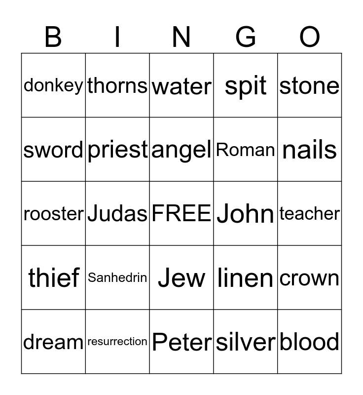 This bingo card has a free space and 24 words: Sanhedrin, resurrection, angel, dream, stone, donkey, sword, thorns, John, Jew, Roman, rooster, linen, crown, priest, silver, teacher, water, nails, Judas, blood, thief, spit and Peter.