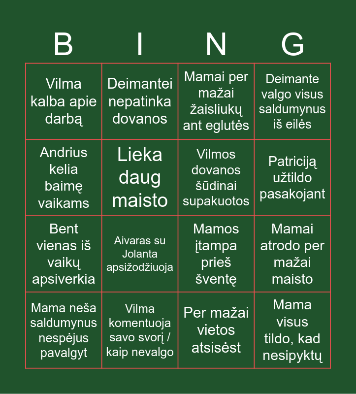 This bingo card has 16 words: Vilma komentuoja savo svorį / kaip nevalgo, Mamai atrodo per mažai maisto, Mamai per mažai žaisliukų ant eglutės, Vilma kalba apie darbą, Bent vienas iš vaikų apsiverkia, Deimantei nepatinka dovanos, Mamos įtampa prieš šventę, Per mažai vietos atsisėst, Andrius kelia baimę vaikams, Lieka daug maisto, Mama neša saldumynus nespėjus pavalgyt, Deimante valgo visus saldumynus iš eilės, Aivaras su Jolanta apsižodžiuoja, Patriciją užtildo pasakojant, Vilmos dovanos šūdinai supakuotos and Mama visus tildo, kad nesipyktų.