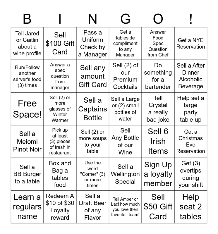 This bingo card has 36 words: Sell a Wellington Special, Use the word "Corner" (3) or more times, Tell Amber or Laci how much you love their favorite l team!, Run/Follow another server's food (3) times, Sell a Meiomi Pinot Noir, Sell a Large or (2) small bottles of water, Answer a spec question from manager, Sell a Draft Beer of any Flavor, Answer Food Spec Question from Chef, Sign Up a loyalty member, Sell a After Dinner Alcoholic Beverage, Get a tableside compliment to any Manager, Get (3) overtips during your shift, Sell (2) or more glasses of Winter Warmer, Sell (2) of our Premium Cocktails, Tell Jared or Caitlin about a wine profile, Sell a BB Burger to a table, Tell Crystal a really bad joke, Free Space!, Pass a Uniform Check by a Manager, Sell a Captains Bottle, Pick up at least (3) pieces of trash in restaurant, Sell Any Bottle of our Wine, Sell (2) or more soups to your table, Sell 6 Irish Items, Sell $100 Gift Card, Do something for a bartender, Redeem A $10 of $30 Loyalty reward, Sell any amount Gift Card, Get a NYE Reservation, Help seat 2 tables, Learn a regulars name, Get a Christmas Eve Reservation, Help set a large party table up, Box and Bag a tables food and Sell $50 Gift Card.