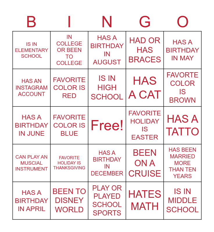 This bingo card has a free space and 54 words: HAS A BIRTHDAY IN DECEMBER, CAN PLAY AN MUSCIAL INSTRUMENT, IS AN ONLY CHILD, IS LEFT-HANDED, HAS A BIRTHDAY IN DECEMBER, HAS SERVED IN THE MILITARY, HAD OR HAS BRACES, HAS A BIRTHDAY IN SEPTEMBER, HAS AN INSTAGRAM ACCOUNT, HAD A BROKEN BONE, IS IN ELEMENTARY SCHOOL, HAS A FACEBOOK ACCOUNT, BEEN TO DISNEY WORLD, HAS A BIRTHDAY IN APRIL, BEEN TO CAROWINDS, PLAY OR PLAYED SCHOOL SPORTS, IS IN MIDDLE SCHOOL, HAS A CAT, CAN SPEAK A FOREIGN LANGUAGE, HAS A TATTO, BEEN ON A CRUISE, HAS A BIRTHDAY IN MARCH, FAVORITE HOLIDAY IS EASTER, HAS A BIRTHDAY IN MAY, LOVE TO SING KARAOKE, IN COLLEGE OR BEEN TO COLLEGE, HAS NEVER WATCHED HOW THE GRINCH STOLE CHRISTMAS, HAS TRAVLED OUTSIDE OF THE COUNTRY, CAN TOUCH THEIR TOES, HATES MATH, DISLIKES CHOCOLATE, BEEN TO A PROFESSIONAL SPORTS GAME, HAS A BIRTHDAY IN JULY, FAVORITE HOLIDAY IS CHRISTMAS, HAS A BIRTHDAY IN AUGUST, HAS A FOOD ALLERGY, HAS A BIRTHDAY IN JUNE, HAS BEEN MARRIED MORE THAN TEN YEARS, HAS A BIRTHDAY IN JANUARY, FAVORITE COLOR IS RED, GOES TO DAYCARE, FAVORITE COLOR IS PURPLE, FAVORITE COLOR IS PINK, HAS A BIRTHDAY IN OCTOBER, FAVORITE HOLIDAY IS THANKSGIVING, HAS A BIRTHDAY IN NOVEMBER, FAVORITE COLOR IS YELLOW, HAS MADE CHRISTMAS COOKIES, IS IN HIGH SCHOOL, FAVORITE COLOR IS BLUE, FAVORTE COLOR IS BROWN, HAS A DOG, FAVORITE COLOR IS BLACK and BEEN TO NEW YORK.