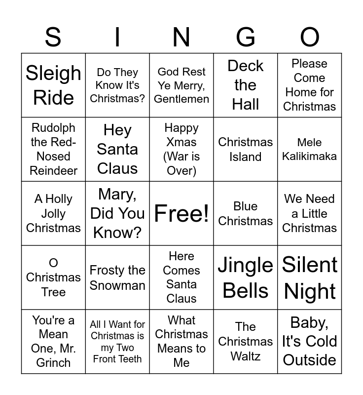 This bingo card has a free space and 81 words: It's the Most Wonderful Time of the Year, Step Into Christmas, God Rest Ye Merry, Gentlemen, Last Christmas, Have Yourself a Merry Little Christmas, Feliz Navidad, Grandma Got Run Over by a Reindeer, Rockin Around the Christmas Tree, Let It Snow! Let It Snow! Let It Snow!, All I want for Christmas Is You, Run Rudolph Run, I Saw 3 Ships, Deck the Hall, Sleigh Ride, Santa Baby, Rudolph the Red-Nosed Reindeer, Wizards in Winter, Frosty the Snowman, Mistletoe, We Need a Little Christmas, I Wish You a Merry Christmas, Please Come Home for Christmas, A Holly Jolly Christmas, Happy Xmas (War is Over), Hey Santa Claus, (There's No Place Like) Home for the Holidays, Hark! The Herald Angels Sing, March of the Wooden Soldiers, Up on the House Top, This Christmas, Mele Kalikimaka, I Want a Hippopotamous for Christmas, What Christmas Means to Me, Do You Hear What I Hear?, You're a Mean One, Mr. Grinch, Blue Christmas, I Saw Mommy Kissing Santa Claus, The Twelve Days of Christmas, Dominick the Donkey, Joy to the World, Baby, It's Cold Outside, O Holy Night, It's Beginning to Look A Lot Like Christmas, Silver and Gold, Mary, Did You Know?, Christmas, Do They Know It's Christmas?, Carol of the Bells, Santa Claus Is Comin' to Town, White Christmas, Jingle Bells, Silent Night, Christmas Time is Here, Caroling, Caroling, The Little Drummer Boy, Underneath the Tree, The Chipmunk Song, Winter Wonderland, Dance of the Sugar Plum Fairy, The Christmas Song, Here Comes Santa Claus, Wonderful Christmastime, Happy Holiday, Where Are You Christmas?, Christmas Eve, The Hallelujah Chorus, O Come All Ye Faithful, Silver Bells, Merry Christmas Darling, The First Noel, Little Saint Nick, O Christmas Tree, All I Want for Christmas is my Two Front Teeth, Santa Tell Me, O Little Town of Bethlehem, A Marshmallow World, I'll Be Home for Christmas, The Christmas Waltz, Jingle Bell Rock, Christmas Island and The Christmas Shoes.