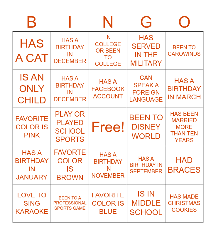 This bingo card has a free space and 51 words: FAVORITE COLOR IS YELLOW, HAS MADE CHRISTMAS COOKIES, IS IN HIGH SCHOOL, FAVORITE COLOR IS BLUE, FAVORTE COLOR IS BROWN, HAS A DOG, HAS A BIRTHDAY IN DECEMBER, CAN PLAY AN MUSCIAL INSTRUMENT, IS AN ONLY CHILD, IS LEFT-HANDED, HAS A BIRTHDAY IN DECEMBER, HAS SERVED IN THE MILITARY, HAD BRACES, HAS A BIRTHDAY IN SEPTEMBER, HAD A BROKEN BONE, IS IN ELEMENTARY SCHOOL, HAS A FACEBOOK ACCOUNT, BEEN TO DISNEY WORLD, HAS A BIRTHDAY IN APRIL, BEEN TO CAROWINDS, PLAY OR PLAYED SCHOOL SPORTS, IS IN MIDDLE SCHOOL, HAS A CAT, CAN SPEAK A FOREIGN LANGUAGE, HAS A TATTO, BEEN ON A CRUISE, HAS A BIRTHDAY IN MARCH, HAS A BIRTHDAY IN MAY, LOVE TO SING KARAOKE, IN COLLEGE OR BEEN TO COLLEGE, HAS NEVER WATCH THE HOW THE GRINCH STOLE CHRISTMAS, HAS TRAVLED OUTSIDE OF THE COUNTRY, CAN TOUCH THEIR TOES, HATES MATH, DISLIKES CHOCOLATE, BEEN TO A PROFESSIONAL SPORTS GAME, HAS A BIRTHDAY IN JULY, FAVORITE HOLIDAY IS CHRISTMAS, HAS A BIRTHDAY IN AUGUST, HAS A BIRTHDAY IN JUNE, HAS BEEN MARRIED MORE THAN TEN YEARS, HAS A BIRTHDAY IN JANUARY, FAVORITE COLOR IS RED, GOES TO DAY CARE, FAVORITE COLOR IS PURPLE, HAS A INTSTAGRAM ACCOUNT, FAVORITE COLOR IS PINK, HAS A BIRTHDAY IN OCTOBER, FAVORITE HOLIDAY IS THANKSGIVING, HAS A BIRTHDAY IN NOVEMBER and FAVORITE COLOR IS BLACK.