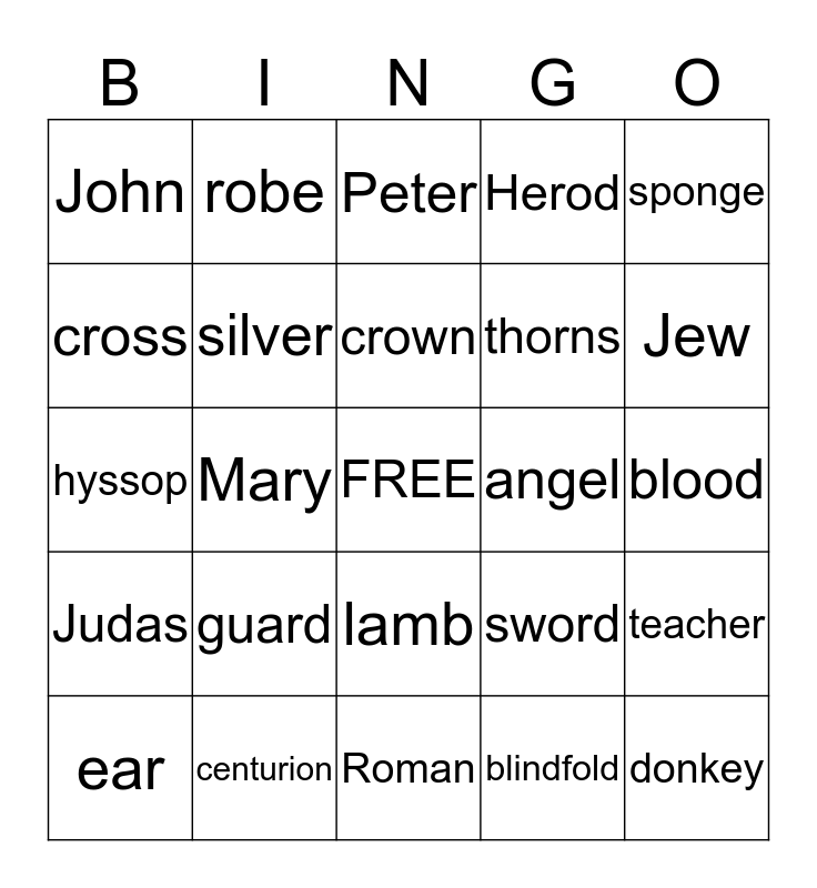 This bingo card has a free space and 24 words: guard, centurion, crown, ear, sponge, John, cross, robe, angel, lamb, thorns, hyssop, sword, teacher, silver, blindfold, blood, Peter, Jew, Mary, donkey, Judas, Herod and Roman.