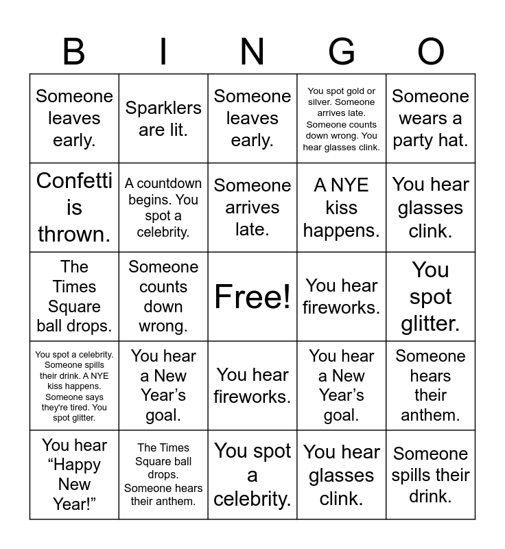 This bingo card has a free space and 54 words: You hear “Happy New Year!” A countdown begins., You spot a celebrity. Someone spills their drink. A NYE kiss happens. Someone says they're tired. You spot glitter., You hear a New Year’s goal., Untitled, You hear fireworks., Someone wears a party hat. Someone takes a selfie. Sparklers are lit., You spot gold or silver. Someone arrives late. Someone counts down wrong. You hear glasses clink., A toast is made., Confetti is thrown., Auld Lang Syne plays. Someone dances., Someone leaves early., You spot the words 2024., The Times Square ball drops. Someone hears their anthem., You hear “Happy New Year!”, A countdown begins., You spot a celebrity., Someone spills their drink., A NYE kiss happens., Someone says they're tired., You spot glitter., You hear a New Year’s goal., Untitled, You hear fireworks., Someone wears a party hat., Someone takes a selfie., Sparklers are lit., You spot gold or silver., Someone arrives late., Someone counts down wrong., You hear glasses clink., A toast is made., Confetti is thrown., Auld Lang Syne plays., Someone dances., Someone leaves early., You spot the words 2024., The Times Square ball drops., Someone hears their anthem., You hear “Happy New Year!”, A countdown begins. You spot a celebrity., Someone spills their drink., A NYE kiss happens., Someone says they're tired., You spot glitter., You hear a New Year’s goal., You hear fireworks. Someone wears a party hat., Someone takes a selfie., Sparklers are lit. You spot gold or silver., Someone arrives late., Someone counts down wrong., You hear glasses clink., A toast is made. Confetti is thrown. Auld Lang Syne plays., Someone dances. Someone leaves early. You spot the words 2024. The Times Square ball drops. and Someone hears their anthem..