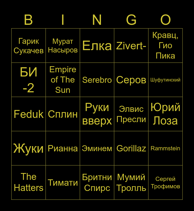 This bingo card has 45 words: Лолита, Руки вверх, Игорь Корнелюк, The Hatters, Алсу, Мумий Тролль, Елка, АNNA ASTI, Кравц, Гио Пика, Тимати, Zivert-, Элвис Пресли, Эминем, Рианна, Мадонна, Бритни Спирс, Джиган, Feduk, Bon Jovi, Шуфутинский, Мурат Насыров, Муслим Магомаев, Игорь Николаев, Гарик Сукачев, Доминик Джокер, Юрий Лоза, Amy Winehouse, Avril Lavigne, Gorillaz, Жуки, Robbie Williams, Rammstein, Сосо Павлиашвили-, Ума Турман, Maroon 5, Сплин, Limp Bizkit, Evanesence, Сергей Трофимов, Serebro, БИ -2, Серов, Пугачева, Empire of The Sun and Минаева.
