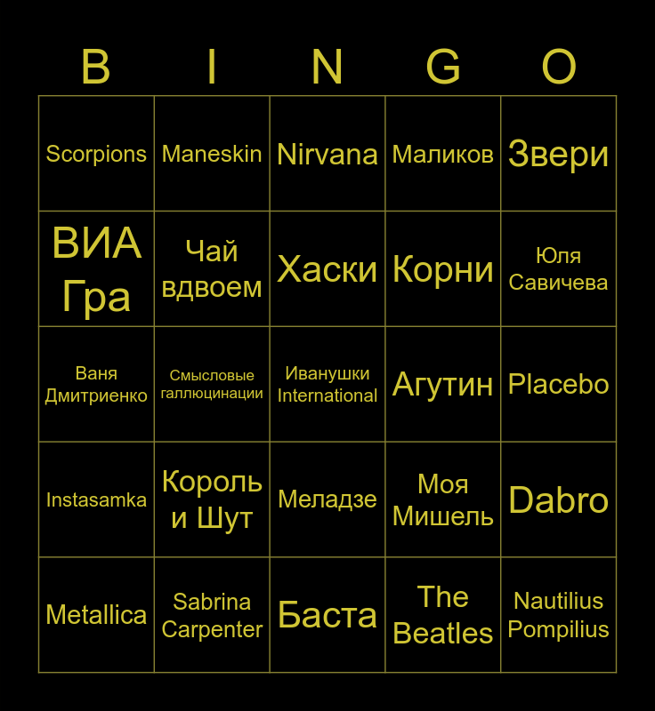 This bingo card has 45 words: Фристайл, Иванушки International, ABBA, Metallica, Kiss, The Beatles, Nirvana, Red Hot Chili Peppers, Звери, Sabrina Carpenter, Маликов, Агутин, Меладзе, Король и Шут, Ляпис Трубецкой-, Баста, NILETTO, Ваня Дмитриенко, Люся Чеботина, Юля Савичева, Maneskin, Panic! At the Disco, The Offspring, Scorpions, Marlyin Manson, Placebo, AC/DC, Aerosmith, Моя Мишель, Instasamka, Ed Sheeran, Dabro, Кино, Toxi$, DEAD BLONDE, Смысловые галлюцинации, PSY, Ленинград, Nautilius Pompilius, Хаски, ВИА Гра, Корни, t.A.T.u, Чай вдвоем and Отпетые мошенники.