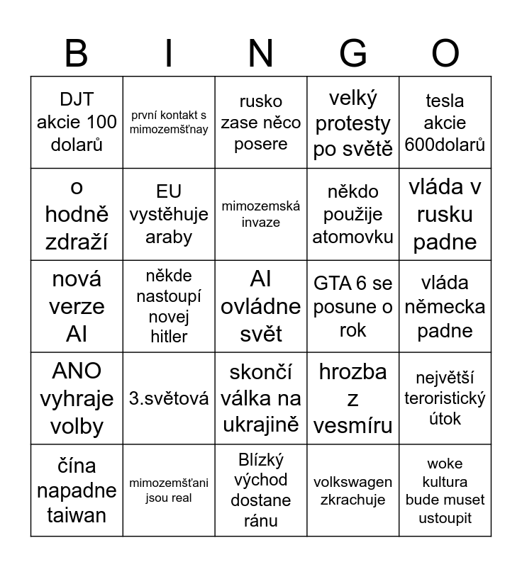 This bingo card has a free space and 24 words: 3.světová, mimozemšťani jsou real, mimozemská invaze, čína napadne taiwan, tesla akcie 600dolarů, DJT akcie 100 dolarů, o hodně zdraží, první kontakt s mimozemšťnay, GTA 6 se posune o rok, skončí válka na ukrajině, někdo použije atomovku, nová verze AI, hrozba z vesmíru, největší teroristický útok, EU vystěhuje araby, volkswagen zkrachuje, vláda německa padne, rusko zase něco posere, vláda v rusku padne, někde nastoupí novej hitler, woke kultura bude muset ustoupit, ANO vyhraje volby, velký protesty po světě and Blízký východ dostane ránu.