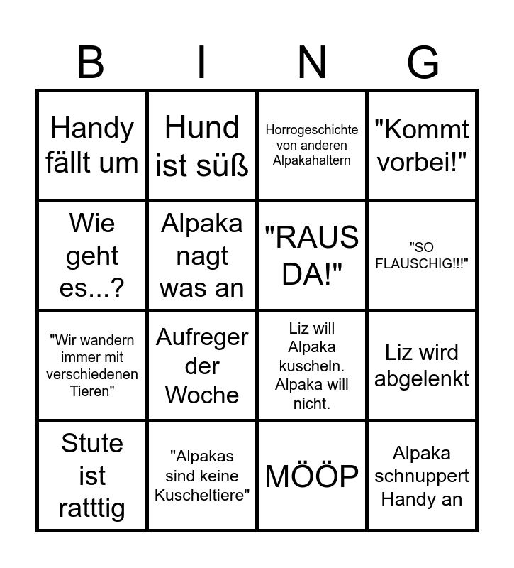 This bingo card has 16 words: "Alpakas sind keine Kuscheltiere", Liz wird abgelenkt, Horrogeschichte von anderen Alpakahaltern, Handy fällt um, "Wir wandern immer mit verschiedenen Tieren", Hund ist süß, Liz will Alpaka kuscheln. Alpaka will nicht., MÖÖP, Wie geht es...?, Alpaka nagt was an, Stute ist ratttig, "Kommt vorbei!", Aufreger der Woche, "SO FLAUSCHIG!!!", "RAUS DA!" and Alpaka schnuppert Handy an.