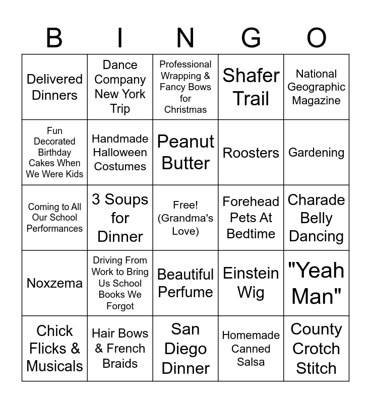 This bingo card has a free space and 29 words: Chick Flicks & Musicals, Canned Peaches, 3 Soups for Dinner, Perfectly Quilted Heirloom Blankets, Delivered Dinners, Professional Wrapping & Fancy Bows for Christmas, Handmade Halloween Costumes, Driving From Work to Bring Us School Books We Forgot, Forehead Pets At Bedtime, Hair Bows & French Braids, Charade Belly Dancing, County Crotch Stitch, San Diego Dinner, Homemade Canned Salsa, Gardening, Zinnias, Beautiful Perfume, Noxzema, National Geographic Magazine, Coming to All Our School Performances, Einstein Wig, Anne of Green Gables, Roosters, Fun Decorated Birthday Cakes When We Were Kids, Shafer Trail, Dance Company New York Trip, "Yeah Man", Peanut Butter and Listening to Elvis on Repeat.