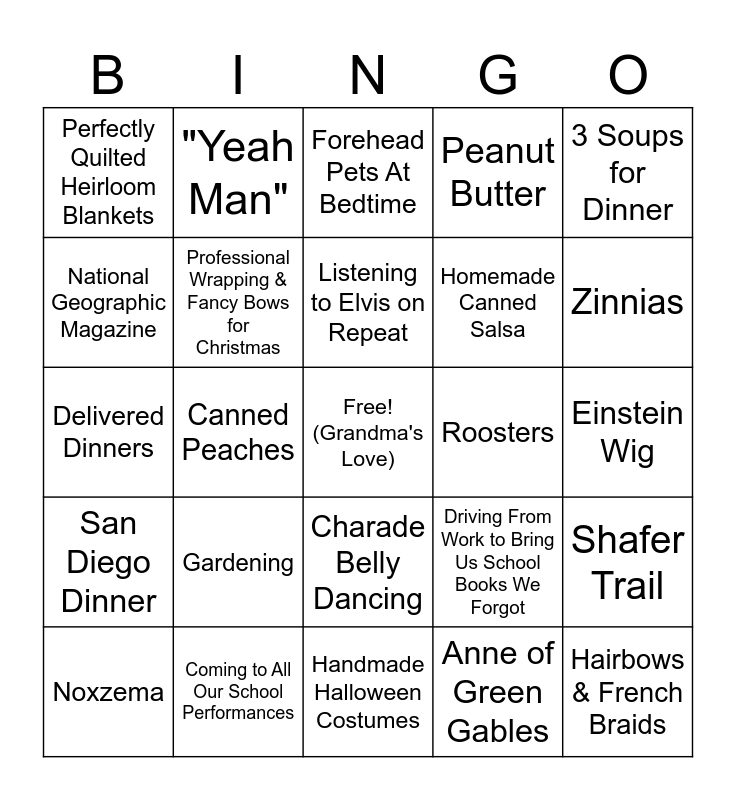 This bingo card has a free space and 29 words: Noxzema, Chick Flicks & Musicals, Canned Peaches, County Crotch Stitch, Perfectly Quilted Heirloom Blankets, Forehead Pets At Bedtime, Professional Wrapping & Fancy Bows for Christmas, Gardening, Roosters, Coming to All Our School Performances, Einstein Wig, Hairbows & French Braids, Handmade Halloween Costumes, Anne of Green Gables, Zinnias, Fun Decorated Birthday Cakes When We Were Kids, Charade Belly Dancing, San Diego Dinner, 3 Soups for Dinner, Delivered Dinners, Driving From Work to Bring Us School Books We Forgot, Beautiful Perfume, Homemade Canned Salsa, National Geographic Magazine, Peanut Butter, "Yeah Man", Shafer Trail, Listening to Elvis on Repeat and Dance Company New York Trip.