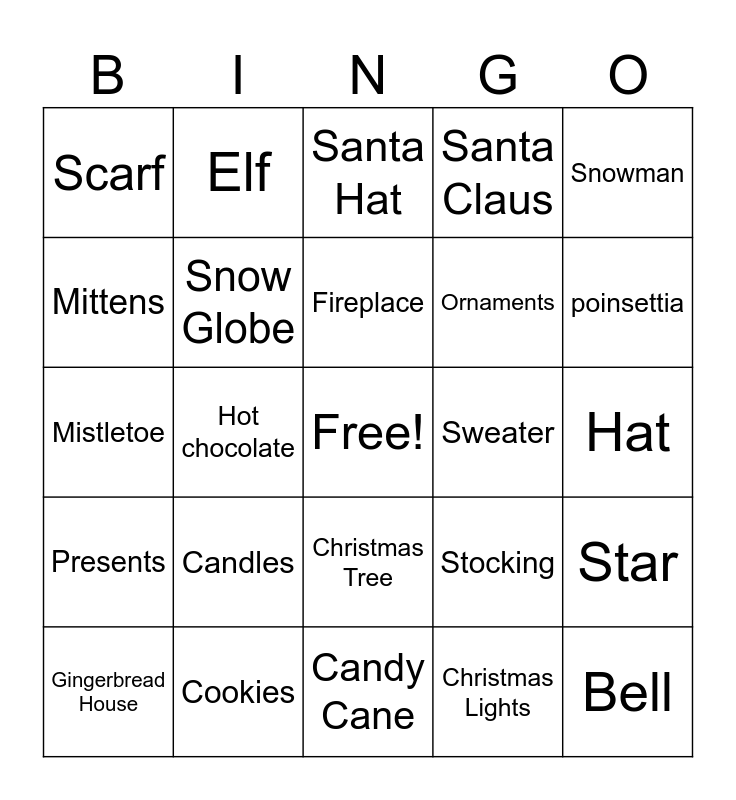 This bingo card has a free space and 29 words: Gingerbread House, Wreath, Hot chocolate, Snow Flakes, Scarf, Santa Hat, Snow Globe, Candles, Sweater, Cookies, Hat, Bell, Candy Cane, Christmas Lights, poinsettia, Santa Letter, Christmas Tree, Presents, Snowman, Mistletoe, Stocking, Ice Skated, Ornaments, Mittens, Santa Claus, Elf, Star, Fireplace and sled.