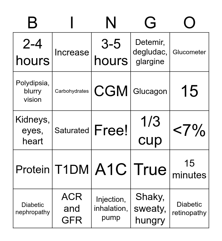 This bingo card has a free space and 65 words: Hypoglycemia, Childhood, Fried and processed foods, 15 minutes, 3-4 hours, Hyperglycemia, Increase, Starchy vegetables, CGM, 40-50 minutes, A1C, Pancreas, <7%, Glucometer, Lowers, Polydipsia, blurry vision, Saturated, 2-4 hours, False, Glucagon, T1DM, Protein, Detemir, degludac, glargine, Afrezza, Medical ID, Beta cells, A1C, BP, Cholesterol, Heart disease, Diabetic retinopathy, Diabetic neuropathy, Diabetic nephropathy, Somogyi phenomenon, Glucose, Insulin, True, ACR and GFR, Smoking, Kidneys, eyes, heart, Shaky, sweaty, hungry, Dawn phenomenon, Carbohydrates, Fats, 1/3 cup, Weight, Fat, 1 serving starch, 15, 22, Fried and processed foods, Regular, aspart, lispro, Rule of 15s or glucagon, <180, Subcutaneous, Injection, inhalation, pump, Daily, 24+ hours, Influenza, 3-5 hours, 4-6 hours, 30 minutes - 1 hour, 1 hour, 4-8 hours, 1-4 hours, 12-24 hours and 30.