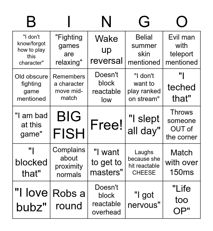 This bingo card has a free space and 25 words: Complains about proximity normals, Doesn't block reactable overhead, Doesn't block reactable low, "I love bubz", Evil man with teleport mentioned, "I don't know/forgot how to play this character", Old obscure fighting game mentioned, "Fighting games are relaxing", "I slept all day", "I want to get to masters", "I don't want to play ranked on stream", "I am bad at this game", Laughs because she hit reactable CHEESE, Match with over 150ms, Remembers a character move mid-match, Gets hit by truck-kun, Throws someone OUT of the corner, Wake up reversal, "I teched that", BIG FISH, "Life too OP", Robs a round, "I blocked that", Belial summer skin mentioned and "I got nervous".