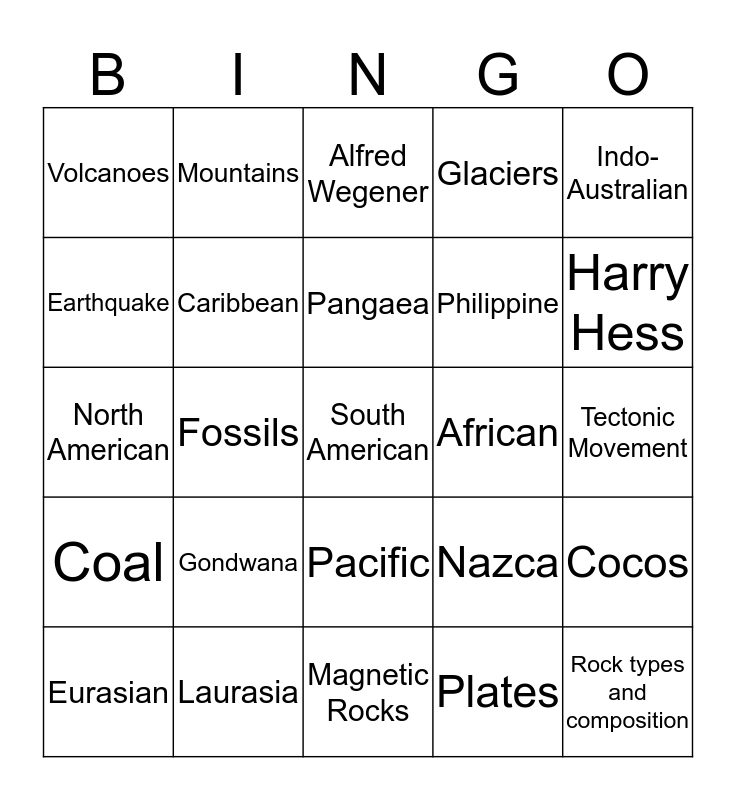 This bingo card has a free space and 24 words: Gondwana, Laurasia, Pangaea, Eurasian, Indo- Australian, Volcanoes, Earthquake, Mountains, African, Pacific, Philippine, North American, Nazca, Cocos, Caribbean, Plates, Tectonic Movement, Alfred Wegener, Harry Hess, Fossils, Rock types and composition, Coal, Glaciers and Magnetic Rocks.