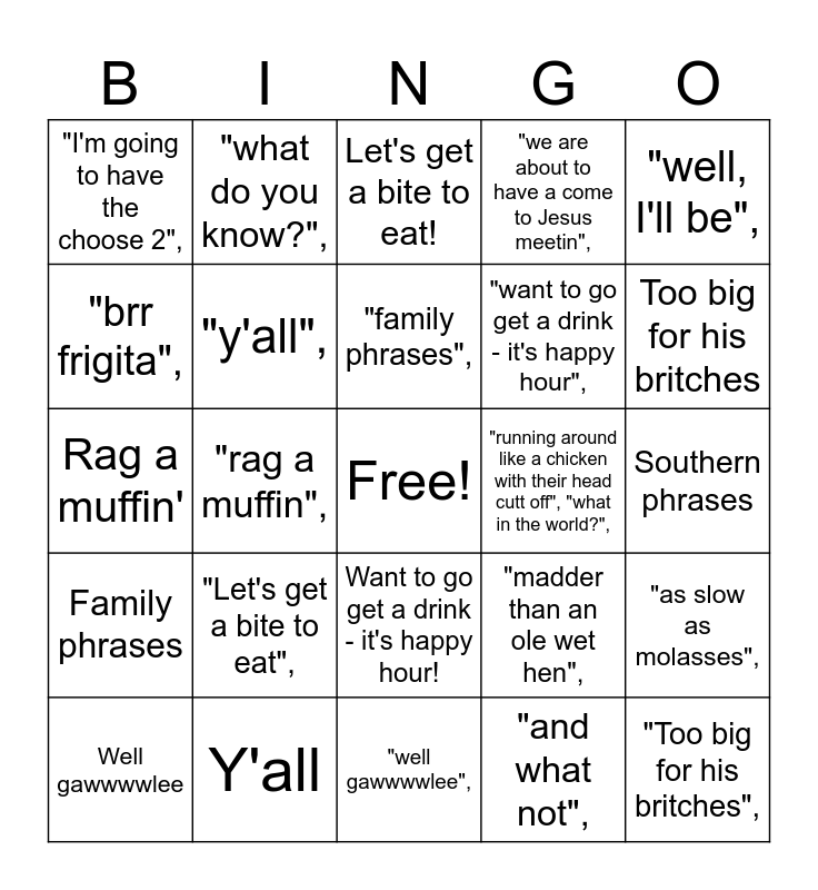 This bingo card has a free space and 51 words: well foot!",, "Too big for his britches",, "bless her heart",, "well gawwwwlee",, "Let's get a bite to eat",, "lovely",, "what do you know?",, "reckon",, "brr frigita",, "fixin' to",, "y'all",, "we are about to have a come to Jesus meetin",, "as slow as molasses",, "madder than an ole wet hen",, "alrighty",, "southern phrases",, "family phrases",, "running around like a chicken with their head cutt off", "what in the world?",, "supper",, "well, I'll be",, "rag a muffin",, "and what not",, "I'm going to have the choose 2",, "want to go get a drink - it's happy hour",, "ready to go, babe?", Well, foot!, Too big for his britches, Bless her heart!, Well gawwwwlee, Let's get a bite to eat!, Lovely, What do you know?, Reckon, Brr frigita, Fixin' to, Y'all, We are about to have a come to Jesus meetin', As slow as molasses, Madder than an ole wet hen, Alrighty, Southern phrases, Family phrases, Running around like a chicken with their head cut off!, What in the world?, Supper, Well, I'll be!, Rag a muffin', And what not..., I'm going to have the choose 2..., Want to go get a drink - it's happy hour! and Ready to go, babe?.