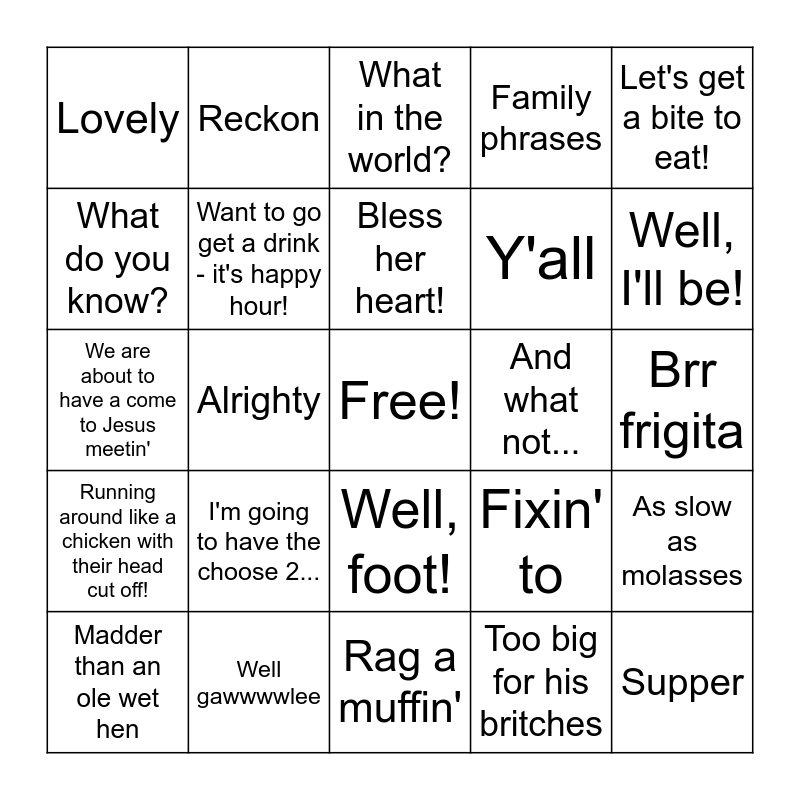 This bingo card has a free space and 26 words: Well, foot!, Too big for his britches, Bless her heart!, Well gawwwwlee, Let's get a bite to eat!, Lovely, What do you know?, Reckon, Brr frigita, Fixin' to, Y'all, We are about to have a come to Jesus meetin', As slow as molasses, Madder than an ole wet hen, Alrighty, Southern phrases, Family phrases, Running around like a chicken with their head cut off!, What in the world?, Supper, Well, I'll be!, Rag a muffin', And what not..., I'm going to have the choose 2..., Want to go get a drink - it's happy hour! and Ready to go, babe?.