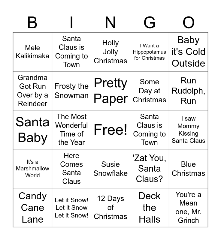This bingo card has a free space and 29 words: Candy Cane Lane, Feliz Navidad, The Most Wonderful Time of the Year, Blue Christmas, Mele Kalikimaka, Holly Jolly Christmas, Frosty the Snowman, Here Comes Santa Claus, Santa Claus is Coming to Town, Let it Snow! Let it Snow Let it Snow!, I saw Mommy Kissing Santa Claus, You're a Mean one, Mr. Grinch, 12 Days of Christmas, Deck the Halls, Run Rudolph, Run, O Tannenbaum, Susie Snowflake, It's a Marshmallow World, Baby it's Cold Outside, Santa Baby, 'Zat You, Santa Claus?, Up on the Housetop, Some Day at Christmas, Grandma Got Run Over by a Reindeer, I Want a Hippopotamus for Christmas, Santa Claus is Coming to Town, Blue Christmas, Pretty Paper and The Chipmunk Song.