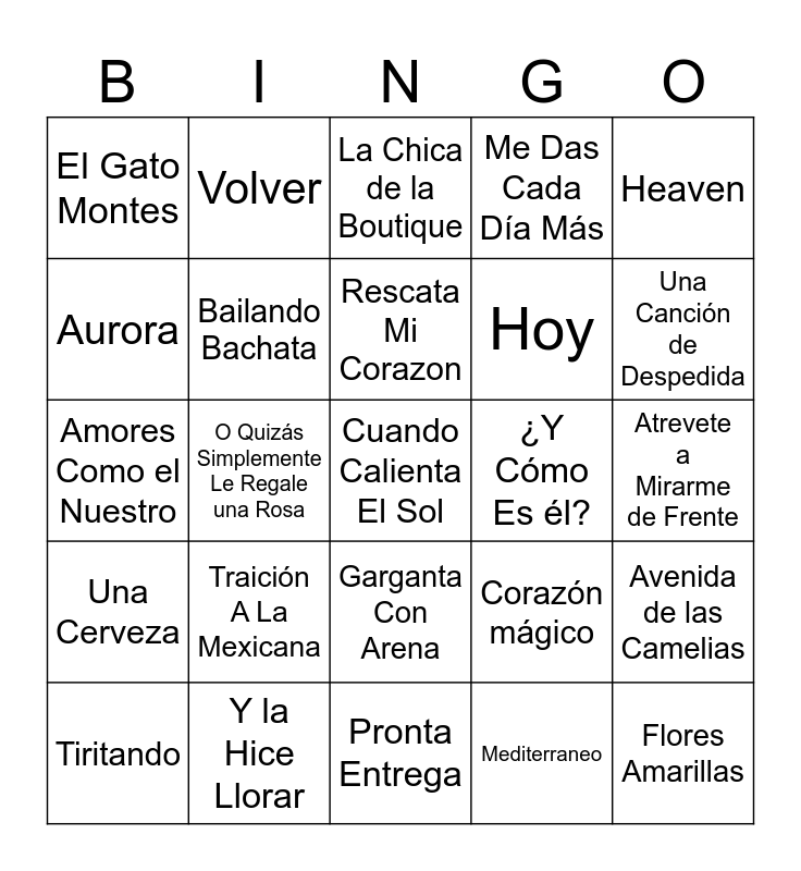 This bingo card has 122 words: Free!, Un Beso Y Una Flor, Te Amo, Canción para Mi Muerte, Porque Yo Te Amo, Trigal, Volver, Noelia, Pronta Entrega, Paisaje, Un Muchacho Como Yo, Es Por Amor, Corazón Contento, Quiero Gritar Que Te Quiero, Lunes Por La Madrugada, Cómo Te Extraño Mi Amor, Tiritando, El Valle Y El Volcan, El Choclo, Vivir Así Es Morir de Amor, Mediterraneo, Rescata Mi Corazon, Esa Chica Es Mía, No quiero ser más tu amigo, El Mar Mas Grande Que Hay, Me Das Cada Día Más, Y la Hice Llorar, Se Me Ha Perdido un Corazón, La Cumbita, Yo Tomo Licor, No Te Creas Tan Importante, Amores Como el Nuestro, Una Cerveza, Se Te Ve la Tanga, La Cobra, De Música Ligera, Lamento Boliviano, Otra Noche, Spending My Time, Waitin', Mariposa tecknicolor, Flaca, Loco (Tu Forma De Ser), La Pachanga, La Guera Salomí, Cachaqueando, Entre La Tierra Y El Cielo, Traición a la Mejicana, Y dale alegría a mi corazón, O Quizás Simplemente Le Regale una Rosa, Detox, Hoy, Ya No Vuelvas, Oncemil, QUE ME FALTE TODO, OJITOS ROJOS, La Morocha, TE AMO, Algo Contigo, Una Canción de Despedida, Cuando Calienta El Sol, Crazy Little Thing Called Love - Remastered 2011, La Chica de Humo, Girls Just Want to Have Fun, Uptown Girl, Bailando Bachata, La Ventanita, Atrevete a Mirarme de Frente, Un Velero Llamado Libertad, Corazón mágico, ¿Y Cómo Es él?, La Chica de la Boutique, Si Un Día Estás Sola, UN SIGLO SIN TI, La Luna y Tú, Movidito, El Gato Montes, Asi Fue, Marinero de Luces, Por quí me abandonaste, Barrilito de Cerveza - Polca, Avenida de las Camelias, Aurora, Disciplina, Mi Amigo el Puma, Sueños, (I Can't Help) Falling In Love With You, Mary Poppins y el deshollinador, Díjame Intentar, 19 Dias y 500 Noches, Flores Amarillas, Te Lo Juro Yo, A Mi Manera, Apuesta por el Amor, Todo Cambia, La Vida Es Una Moneda, El Tempano, Soy Lo Que Soy, Como Dos Extraños, Garganta Con Arena, Nada, Pedro Canoero, Cara de Gitana, Sweet Child O' Mine, Every Breath You Take, Heaven, Nothing's Gonna Stop Us Now, Total Eclipse of the Heart, The Time Of My Life, Cosas de la Vida, The Best, Vasos Vacíos, Aprender A Volar, Mariposa Mía, Traición A La Mexicana, Sin Ti, Arena y Sol, Obsesión, A fuego lento, Universo Paralelo, Ocho Cuarenta and Te Mentiría.