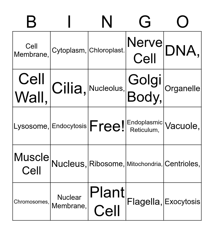 This bingo card has a free space and 24 words: Nucleus,, Nuclear Membrane,, Nucleolus,, Chromosomes,, DNA,, Cell Membrane,, Cell Wall,, Cytoplasm,, Endoplasmic Reticulum,, Ribosome,, Golgi Body,, Lysosome,, Mitochondria,, Centrioles,, Cilia,, Flagella,, Vacuole,, Chloroplast., Organelle, Endocytosis, Exocytosis, Muscle Cell, Nerve Cell and Plant Cell.