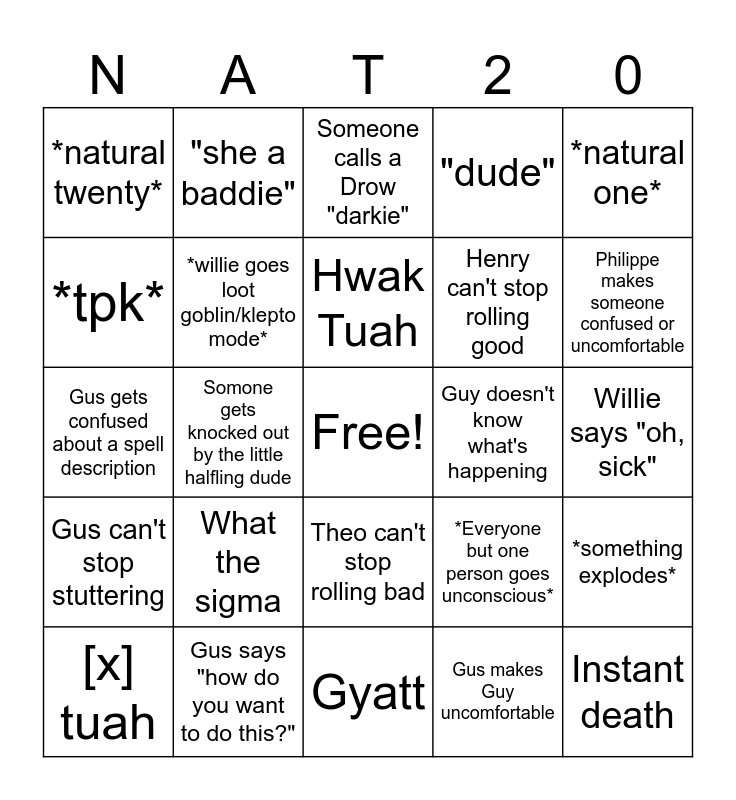 This bingo card has a free space and 25 words: What the sigma, Gyatt, Hwak Tuah, [x] tuah, *natural one*, *natural twenty*, *tpk*, "she a baddie", Guy doesn't know what's happening, Theo can't stop rolling bad, Henry can't stop rolling good, Gus gets confused about a spell description, *Everyone but one person goes unconscious*, *something explodes*, *willie goes loot goblin/klepto mode*, Gus says "rocks fall, you die", Willie says "oh, sick", Someone calls a Drow "darkie", Philippe makes someone confused or uncomfortable, Somone gets knocked out by the little halfling dude, Instant death, Gus says "how do you want to do this?", Gus can't stop stuttering, "dude" and Gus makes Guy uncomfortable.
