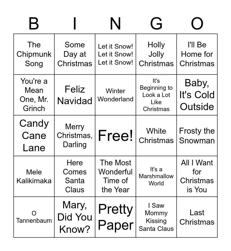 This bingo card has a free space and 40 words: Christmas (Baby Please Come Home), Candy Cane Lane, Rockin' Around the Christmas Tree, Feliz Navidad, Mary, Did You Know?, The Most Wonderful Time of the Year, Winter Wonderland, Blue Christmas, I'll Be Home for Christmas, Mele Kalikimaka, Merry Christmas, Darling, Holly Jolly Christmas, Last Christmas, Frosty the Snowman, White Christmas, Here Comes Santa Claus, Christmas Time is Here, The Chipmunk Song, Little Saint Nick, Let it Snow! Let it Snow! Let it Snow!, All I Want for Christmas is You, I Saw Mommy Kissing Santa Claus, It's Beginning to Look a Lot Like Christmas, You're a Mean One, Mr. Grinch, Santa Claus is Coming to Town, Jingle Bell Rock, 12 Days of Christmas, Deck the Halls, I want a Hippopotamus for Christmas, Run Rudolph, Run, Grandma Got Run Over by a Reigndeer, O Tannenbaum, Susie Snowflake, It's a Marshmallow World, Baby, It's Cold Outside, Pretty Paper, 'Zat You, Santa Claus?, Santa Baby, Some Day at Christmas and Up on the Housetop.