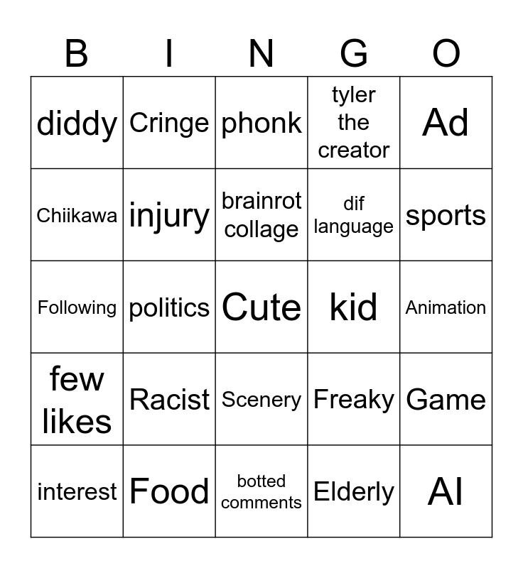 This bingo card has a free space and 24 words: Racist, Food, brainrot collage, interest, Ad, diddy, Chiikawa, Cringe, kid, Scenery, dif language, Following, Freaky, Game, injury, Elderly, Animation, phonk, sports, politics, AI, few likes, tyler the creator and botted comments.