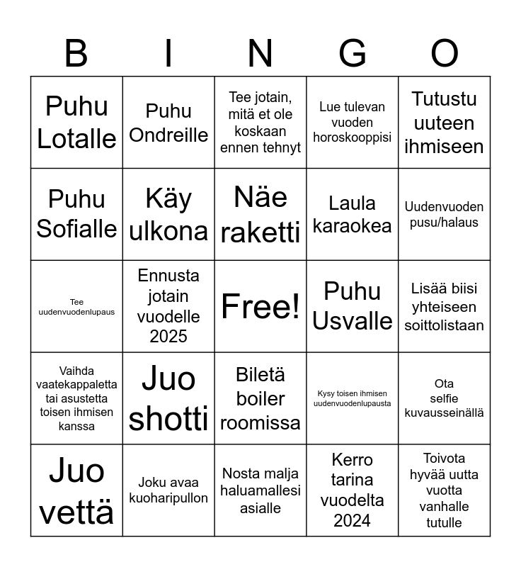 This bingo card has a free space and 24 words: Juo shotti, Joku avaa kuoharipullon, NÀe raketti, Juo vettÀ, Tutustu uuteen ihmiseen, Puhu Lotalle, Puhu Sofialle, Puhu Ondreille, Puhu Usvalle, BiletÀ boiler roomissa, Laula karaokea, Tee uudenvuodenlupaus, Kysy toisen ihmisen uudenvuodenlupausta, Ota selfie kuvausseinÀllÀ, KÀy ulkona, Kerro tarina vuodelta 2024, LisÀÀ biisi yhteiseen soittolistaan, Tee jotain, mitÀ et ole koskaan ennen tehnyt, Uudenvuoden pusu/halaus, Ennusta jotain vuodelle 2025, Toivota hyvÀÀ uutta vuotta vanhalle tutulle, Vaihda vaatekappaletta tai asustetta toisen ihmisen kanssa, Lue tulevan vuoden horoskooppisi and Nosta malja haluamallesi asialle.