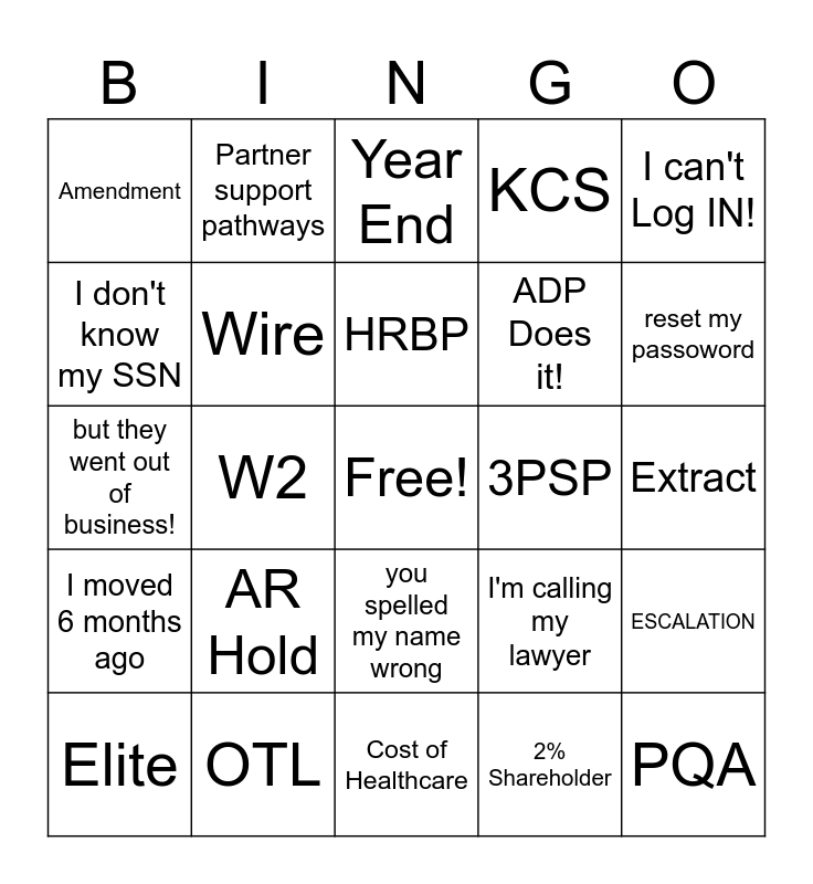 This bingo card has a free space and 29 words: Elite, SCT, W2, 1099, Amendment, Year End, Wire, AR Hold, 3PSP, OTL, Extract, PQA, Cost of Healthcare, 2% Shareholder, reset my passoword, where is my package?, you spelled my name wrong, I moved 6 months ago, I can't Log IN!, but they went out of business!, I'm calling my lawyer, data error, ADP Does it!, I don't know my SSN, KCS, Partner support pathways, ESCALATION, HRBP and clear cache and cookies.