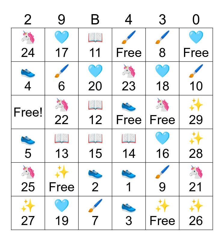 This bingo card has 36 words: 👟 1, 👟 2, 👟 3, 👟 4, 👟 5, 👟 Free, 🖌️ 6, 🖌️ 7, 🖌️ 8, 🖌️ 9, 🖌️ 10, 🖌️ Free, 🦄 21, 🦄 22, 🦄 23, 🦄 24, 🦄 25, 🦄 Free, Free!, 📖 11, 📖 12, 📖 13, 📖 14, 📖 15, 🩵 16, 🩵 17, 🩵 18, 🩵 19, 🩵 20, 🩵 Free, ✨ 26, ✨ 27, ✨ 28, ✨ 29, ✨ Free and ✨ Free.