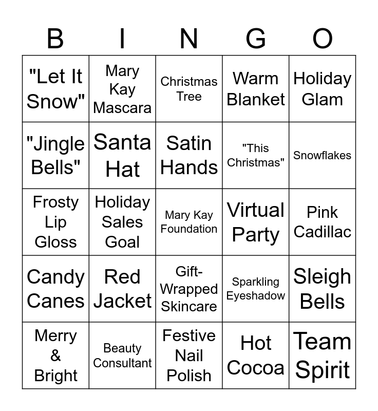 This bingo card has a free space and 24 words: Merry & Bright, Red Jacket, Satin Hands, Hot Cocoa, Holiday Glam, "Let It Snow", Mary Kay Mascara, Christmas Tree, Virtual Party, Pink Cadillac, Frosty Lip Gloss, Santa Hat, Sparkling Eyeshadow, Sleigh Bells, "Jingle Bells", Beauty Consultant, Festive Nail Polish, Warm Blanket, Snowflakes, Candy Canes, Holiday Sales Goal, Gift-Wrapped Skincare, "This Christmas" and Team Spirit.
