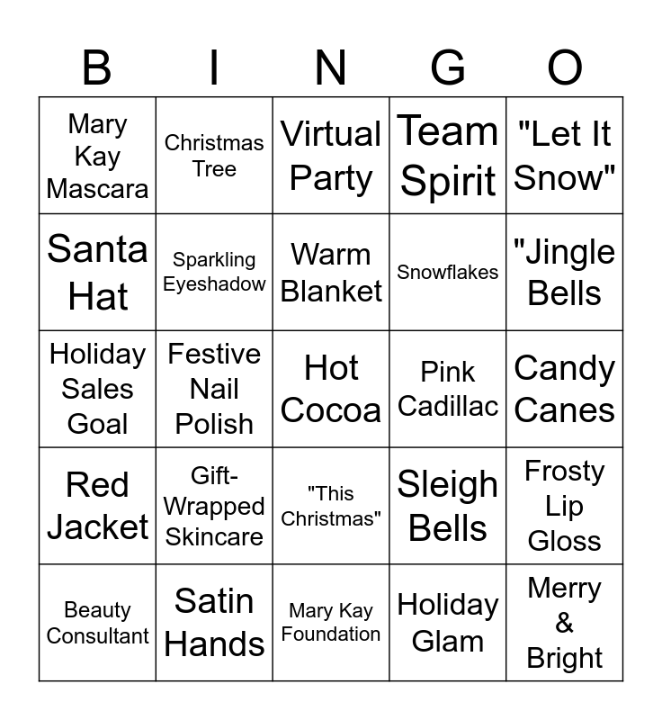 This bingo card has 25 words: Red Jacket, Satin Hands, Hot Cocoa, Holiday Glam, "Let It Snow", Mary Kay Mascara, Christmas Tree, Virtual Party, Pink Cadillac, Frosty Lip Gloss, Santa Hat, Sparkling Eyeshadow, Mary Kay Foundation, Sleigh Bells, "Jingle Bells, Beauty Consultant, Festive Nail Polish, Warm Blanket, Snowflakes, Candy Canes, Holiday Sales Goal, Gift-Wrapped Skincare, "This Christmas", Team Spirit and Merry & Bright.