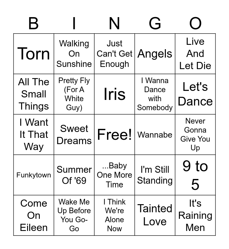 This bingo card has a free space and 35 words: Wonderwall, No Diggity, All Star, Pretty Fly (For A White Guy), ...Baby One More Time, Angels, All The Small Things, Creep, Iris, Common People, I Want It That Way, Live And Let Die, We Didn't Start the Fire, Mambo No. 5, Torn, Wannabe, Tainted Love, Sweet Dreams, Funkytown, It's Raining Men, I'm Still Standing, Come On Eileen, 9 to 5, Wake Me Up Before You Go-Go, Just Can't Get Enough, Let's Dance, You Make My Dreams, Karma Chameleon, I Wanna Dance with Somebody, Never Gonna Give You Up, Should I Stay or Should I Go, I Think We're Alone Now, Summer Of '69, Walking On Sunshine and Uptown Girl.