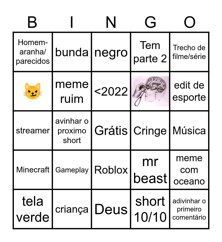 This bingo card has 1 images, a free space and 23 words: Gameplay, criança, <2022, tela verde, Trecho de filme/série, Homem-aranha/ parecidos, 😼, bunda, Cringe, Roblox, streamer, mr beast, meme com oceano, meme ruim, short 10/10, Música, negro, edit de esporte, avinhar o proximo short, adivinhar o primeiro comentário, Minecraft, Tem parte 2 and Deus.