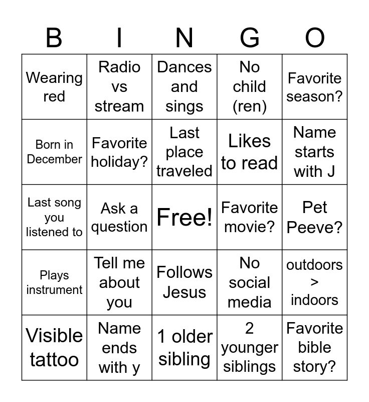 This bingo card has a free space and 24 words: Tell me about you, Name ends with y, Last place traveled, Visible tattoo, Favorite season?, Wearing red, Born in December, Radio vs stream, Favorite movie?, Follows Jesus, Likes to read, Last song you listened to, No social media, outdoors > indoors, Favorite holiday?, 2 younger siblings, Pet Peeve?, Dances and sings, Name starts with J, Ask a question, Favorite bible story?, Plays instrument, No child (ren) and 1 older sibling.