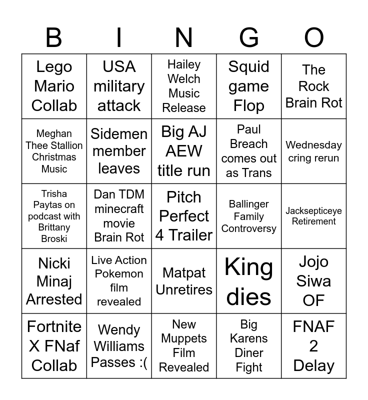 This bingo card has a free space and 24 words: Live Action Pokemon film revealed, Wendy Williams Passes :(, Big AJ AEW title run, Fortnite X FNaf Collab, The Rock Brain Rot, Lego Mario Collab, Meghan Thee Stallion Christmas Music, USA military attack, Ballinger Family Controversy, Matpat Unretires, Paul Breach comes out as Trans, Trisha Paytas on podcast with Brittany Broski, King dies, Jojo Siwa OF, Sidemen member leaves, Big Karens Diner Fight, Jacksepticeye Retirement, Hailey Welch Music Release, Wednesday cring rerun, Dan TDM minecraft movie Brain Rot, FNAF 2 Delay, Nicki Minaj Arrested, Squid game Flop and New Muppets Film Revealed.
