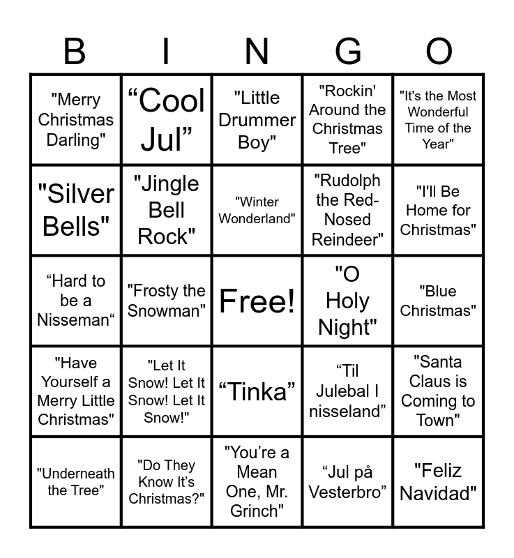 This bingo card has a free space and 38 words: "All I Want For Christmas Is You", "Last Christmas", "White Christmas", "Jingle Bell Rock", "Santa Claus is Coming to Town", "Let It Snow! Let It Snow! Let It Snow!", "Winter Wonderland", "The Christmas Song", "It's the Most Wonderful Time of the Year", "Rudolph the Red-Nosed Reindeer", "Frosty the Snowman", "Rockin' Around the Christmas Tree", "Feliz Navidad", "Blue Christmas", "Silver Bells", "Have Yourself a Merry Little Christmas", "Holly Jolly Christmas", "Little Drummer Boy", "Sleigh Ride", "O Holy Night", "Merry Christmas Darling", "Do They Know It’s Christmas?", "I'll Be Home for Christmas", "Underneath the Tree", "Mistletoe", "You’re a Mean One, Mr. Grinch", "This Christmas", “Snowman”, "12 Days of Christmas", “Nu er det jule igen”, “Jesus og josefine”, “Tinka”, “Jul på Vesterbro”, “Cool Jul”, “Bamse”, “Til Julebal I nisseland”, “Hard to be a Nisseman“ and “Dejlig er den Himmel Blå”.