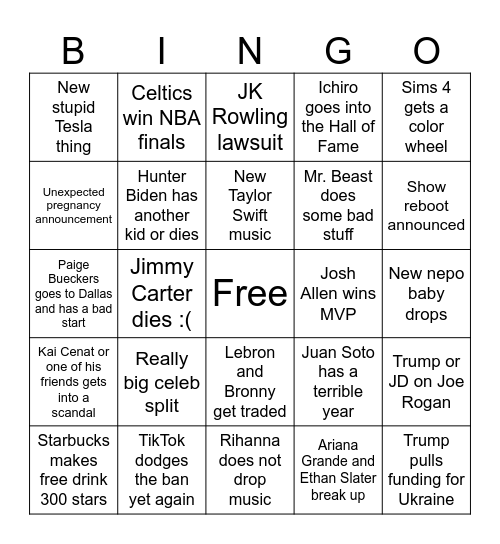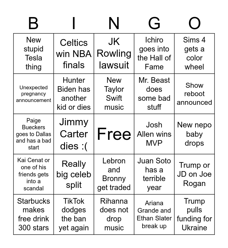 This bingo card has a free space and 24 words: Really big celeb split, TikTok dodges the ban yet again, New Taylor Swift music, Starbucks makes free drink 300 stars, Sims 4 gets a color wheel, New stupid Tesla thing, Unexpected pregnancy announcement, Celtics win NBA finals, Josh Allen wins MVP, Lebron and Bronny get traded, Mr. Beast does some bad stuff, Paige Bueckers goes to Dallas and has a bad start, Juan Soto has a terrible year, Trump or JD on Joe Rogan, Hunter Biden has another kid or dies, Ariana Grande and Ethan Slater break up, New nepo baby drops, JK Rowling lawsuit, Show reboot announced, Jimmy Carter dies :(, Trump pulls funding for Ukraine, Kai Cenat or one of his friends gets into a scandal, Ichiro goes into the Hall of Fame and Rihanna does not drop music.
