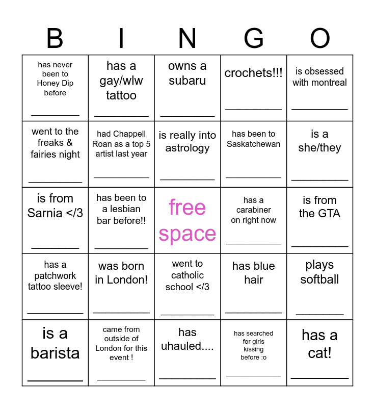 This bingo card has a free space and 24 words: was born in London! _________, came from outside of London for this event ! ___________, is really into astrology _________, is a barista ______, is obsessed with montreal ___________, has never been to Honey Dip before ___________, went to the freaks & fairies night __________, has a gay/wlw tattoo ________, has a carabiner on right now ____________, went to catholic school </3 __________, has been to Saskatchewan ____________, is from Sarnia </3 _______, has blue hair _________, plays softball _______, had Chappell Roan as a top 5 artist last year ____________, has searched for girls kissing before :o _______________, is from the GTA _________, owns a subaru ________, is a she/they _________, has been to a lesbian bar before!! __________, has a cat! _______, has a patchwork tattoo sleeve! ___________, crochets!!! ________ and has uhauled.... _________.