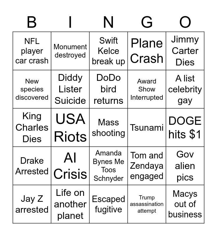 This bingo card has a free space and 24 words: AI Crisis, Life on another planet, DoDo bird returns, Jay Z arrested, Jimmy Carter Dies, NFL player car crash, New species discovered, Monument destroyed, Tsunami, Amanda Bynes Me Toos Schnyder, Award Show Interrupted, King Charles Dies, Tom and Zendaya engaged, Gov alien pics, Diddy Lister Suicide, Trump assassination attempt, DOGE hits $1, Swift Kelce break up, A list celebrity gay, USA Riots, Macys out of business, Drake Arrested, Plane Crash and Escaped fugitive.